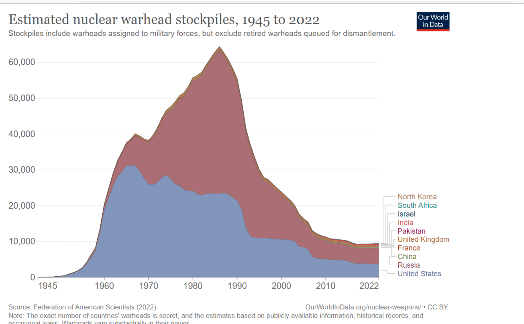 Hier een blik op de aantallen kernwapens in de wereld in de loop van de tijd (zie afbeelding). Veel kernwapens zijn reeds verwijderd. Zoals je ziet leidde het einde van de Koude Oorlog een snelle afname in, maar is het proces van verdere ontwapening met name de afgelopen tien jaar volledig gestagneerd. Hoewel het aantal kernwapens dus fors lager is dan op het hoogtepunt van de Koude Oorlog staan nog altijd meer dan voldoende kernwapens inzetklaar om de wereld vele malen te kunnen vernietigen.