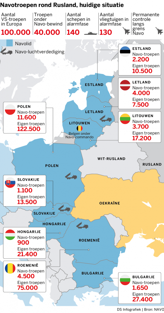 Het IJzeren Gordijn liep tijdens de koude oorlog dwars door Europa tussen het communistische Oostblok en het kapitalistische Westen (zie eerste landkaart). Tussen de wereldmachten de Sovjet-Unie en de Verenigde Staten vond een (nucleaire) wapenwedloop plaats. De landen van het Oostblok en de Sovjet-Unie waren destijds lid van het militaire bondgenootschap het Warschaupact, dat is in 1991 ontbonden. Zijn tegenhanger de NAVO, het verbond van westerse landen, werd helaas niet ontbonden. Na de val van het IJzeren Gordijn zijn Oost-Europese landen lid geworden van de NAVO. Rusland en enkele buurlanden (nog) niet. Vandaag de dag is het IJzeren Gordijn naar het oosten opgeschoven (zie tweede landkaart). Het potentiële slagveld tussen de wereldmachten blijft nog steeds Europa. De NAVO stationeerde anti-raketafweersystemen dichterbij de Russische grens, zogenaamd om raketten uit Iran te kunnen onderscheppen (zie derde kaartje). Als de buurstaat Oekraïne ook onderdeel van de NAVO zou worden, is het zeer reëel om er op Rusland gerichte (massavernietigings)wapens te stationeren. De huidige oorlog van Rusland tegen Oekraïne heeft tot een extreem gevaarlijke situatie geleid, omdat twee – direct of indirect – bij het conflict betrokken partijen, Rusland en meerdere NAVO-lidstaten, over massavernietigingswapens beschikken.